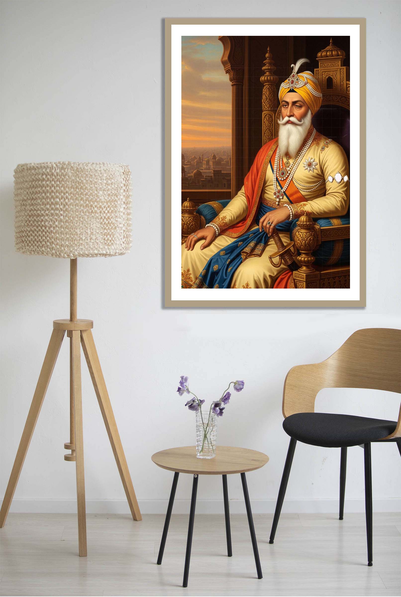 Beyond his military prowess, Maharaja Ranjit Singh was a progressive and secular rule. His administration was known for its religious tolerance, where Hindus, Muslims, and Sikhs held positions of power based on merit. He restored and beautified sacred sites, including the Harmandir Sahib (Golden Temple), which he covered with marble and gold. Moreover, this painting is more than just a portrait; it is a powerful symbol of a ruler who brought unprecedented stability and prosperity to the Punjab, leaving behind a legacy of strength, tolerance, and enlightened governance; Maharaja Ranjeet Singh Artwork.