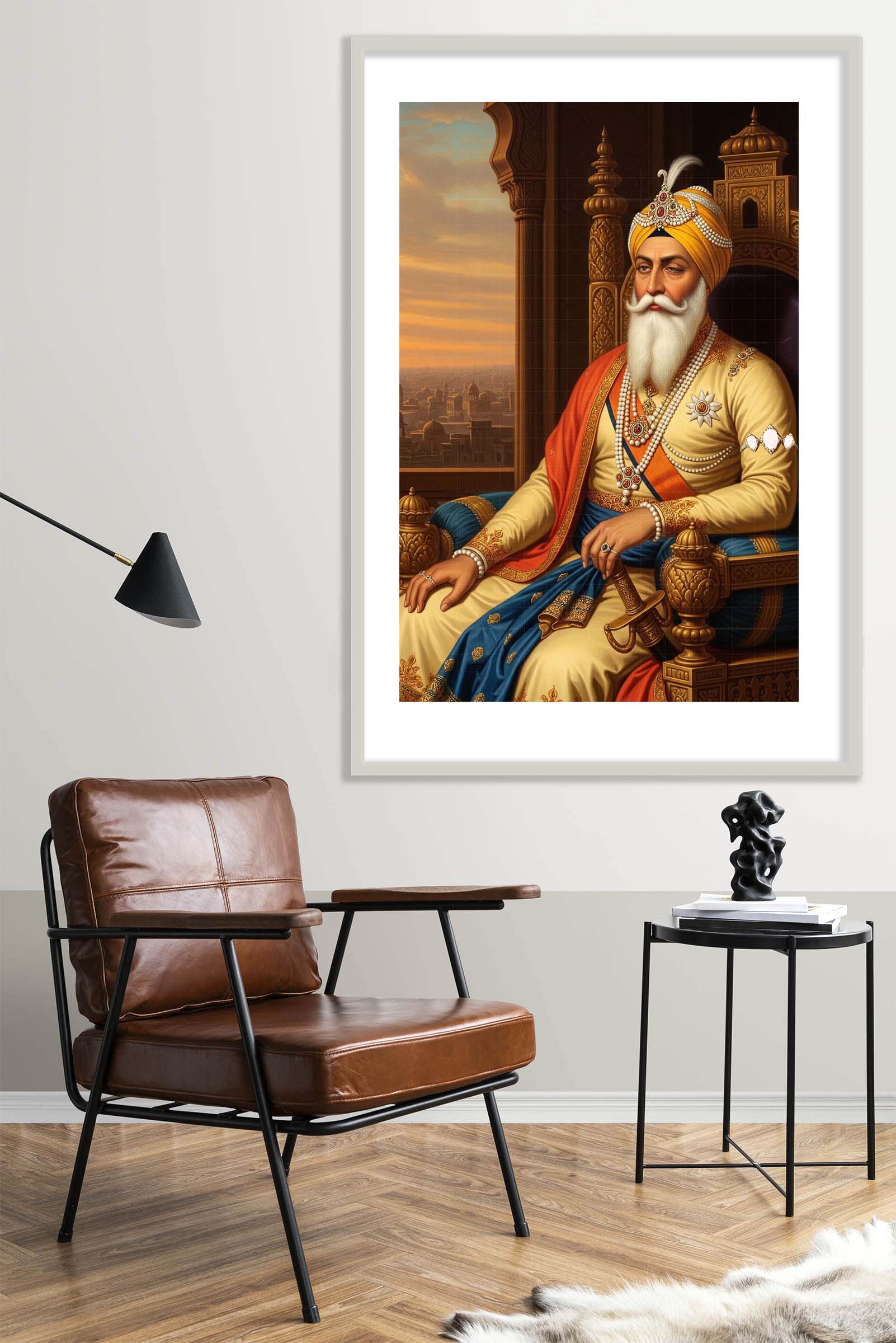 Step into the grandeur of Sikh history with this captivating Maharaja Ranjeet Singh Artwork, the Sher-e-Punjab (Lion of Punjab). Born in 1780, he was a unifier and a visionary who consolidated the fragmented Sikh misls (confederacies) into a formidable empire that stretched from the Khyber Pass to the Sutlej River. Indeed, despite losing one eye to smallpox in his childhood, his single-minded vision and military genius were unparalleled. He modernized his army, blending traditional Sikh cavalry tactics with European military training, creating a force that remained undefeated.