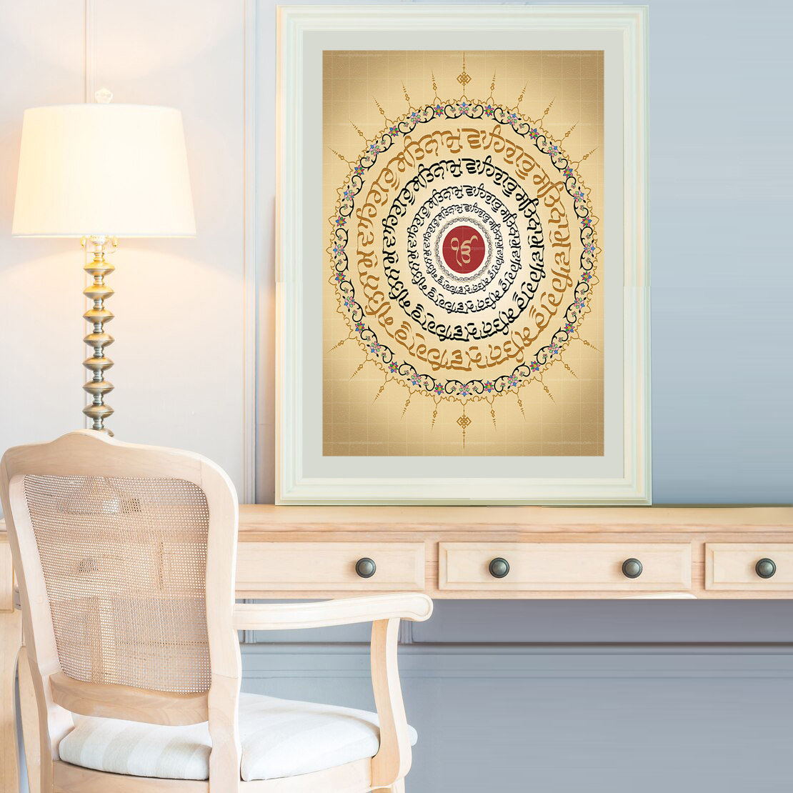 Firstly, the inspiration of this painting comes from the sikh religion spirit that resides in every punjabi’s heart and soul. The light and calming shades of gold, yellow and red add to the serenity of this sikh painting. Moreover, this decor is deeply- rooted into the Sikh culture and traditions. Be there any negative energies in your place, this religious painting is an absorber of all! Additionally, this Ik Onkaar painting brings a sense of joy and peace to your homes and offices.