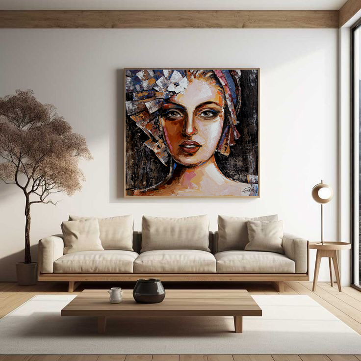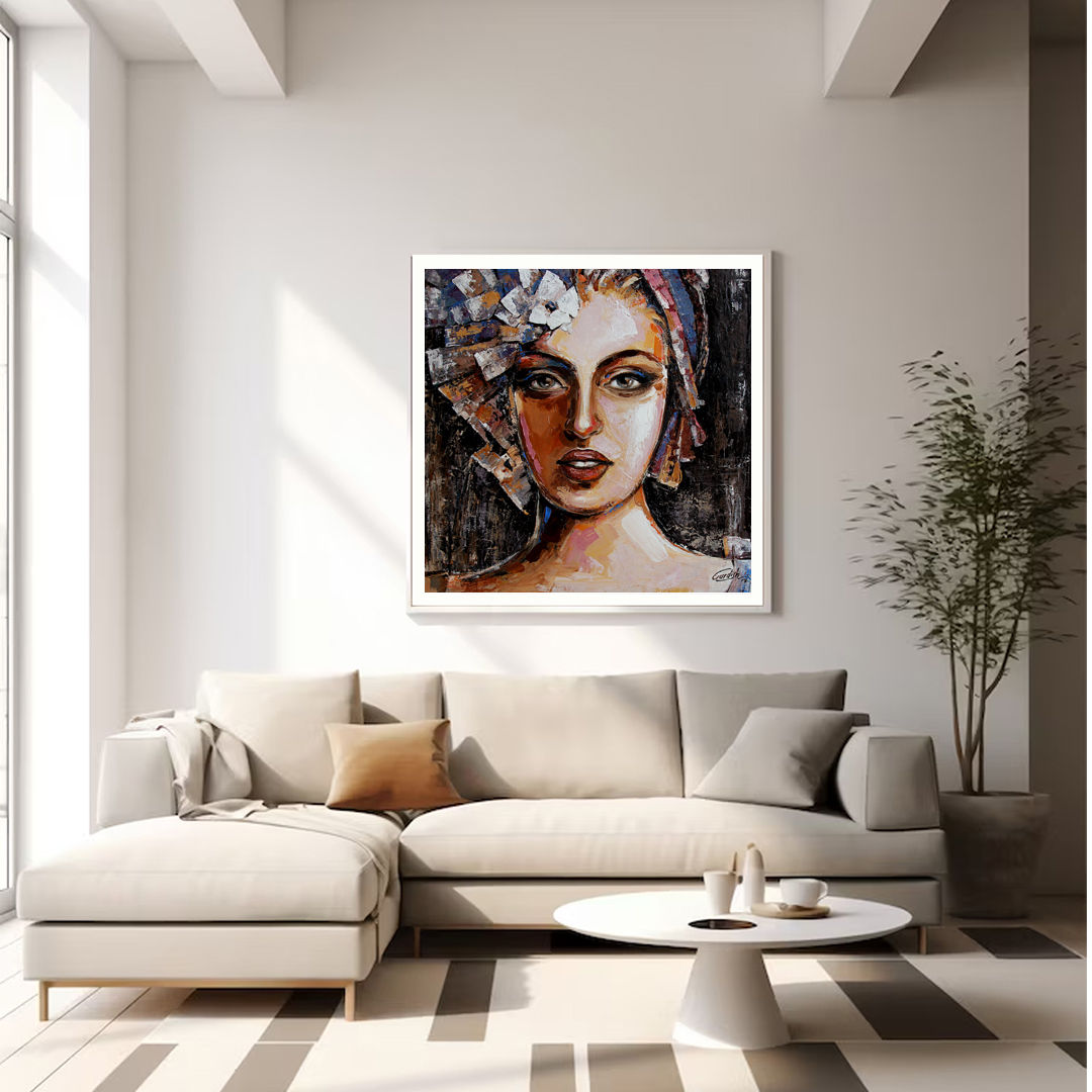 Portrait of Madame is a modern portrait inspired from the early 15th century Europe. The artist has used shades of peach, gold and blue to color this aesthetic artwork which add life to this portrait. This modern artwork depicts peace and tranquility.