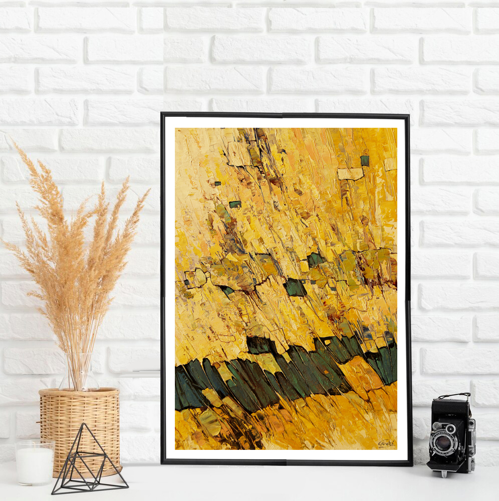 Glimpse of Paradise is a motivational painting. The artist has painted this modern artwork in bright yellow, gold and green hues. This abstract painting looks quite aesthetic and gives off modern vibes.