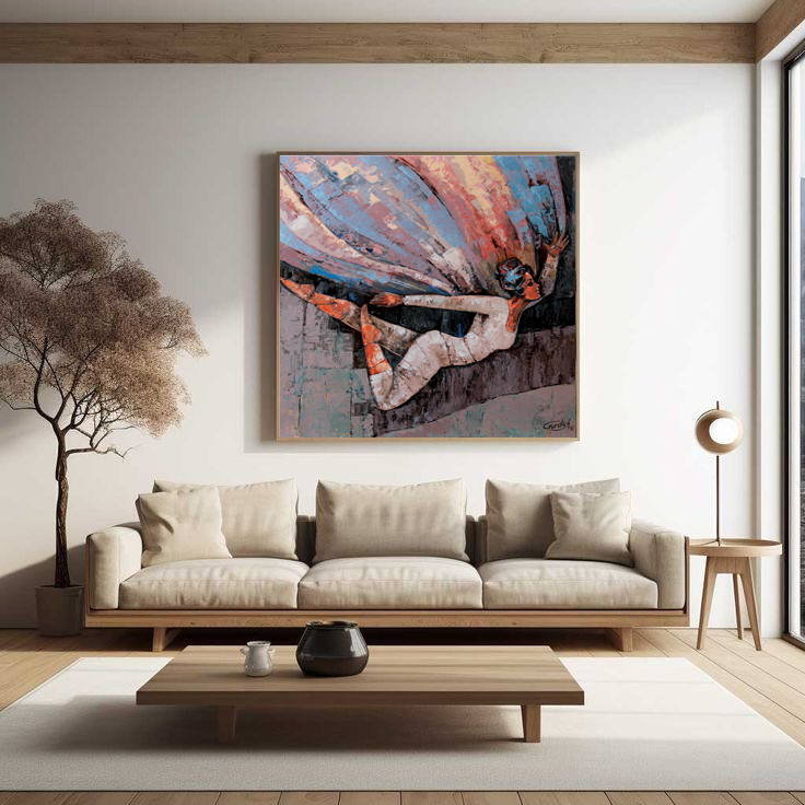 The artist deliberately chooses aerial dance to evoke a sense of glee and triumph in this figurative artwork. The dancer expresses her true emotions through the movements of this dance form. These emotions are nothing but reflections of the celebratory atmosphere surrounding them.